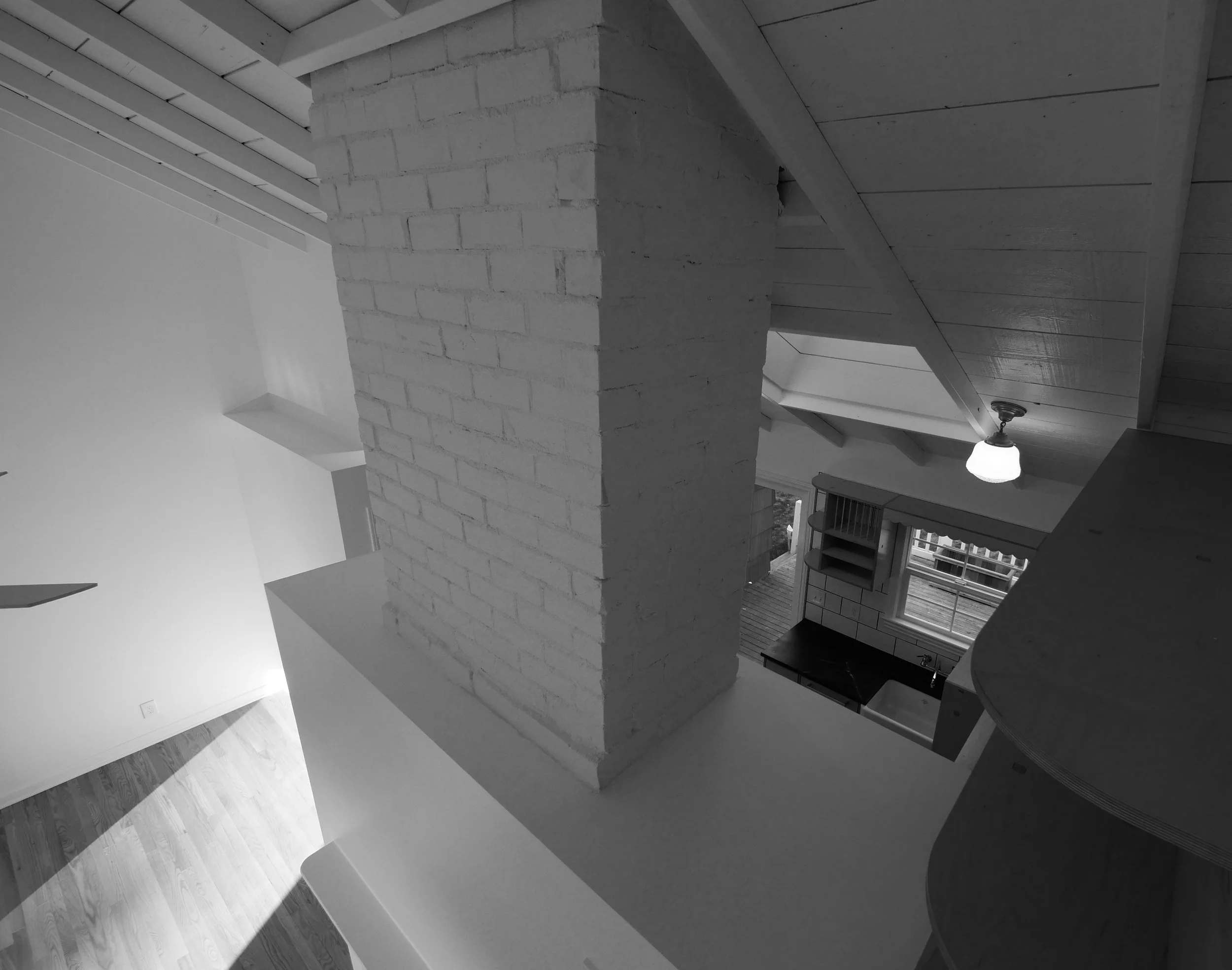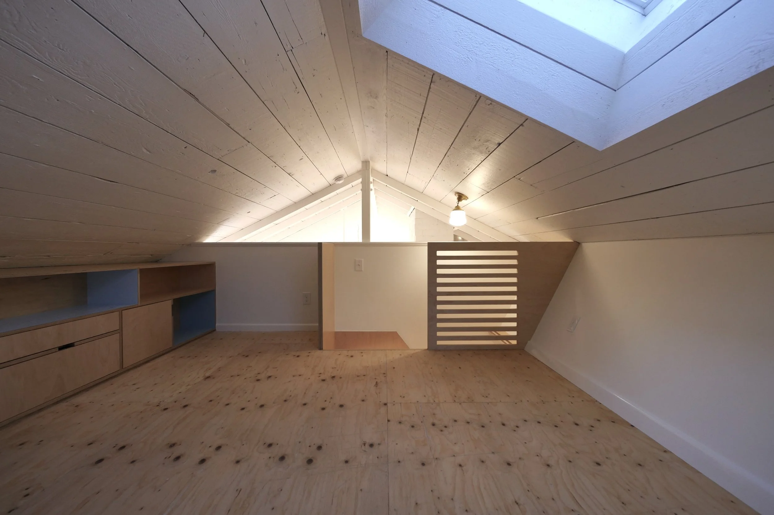 Whole house remodel of 1947 cape for a collector: vaulted ceiling with new over-framed roof, mechanical, electrical, plumbing, kitchen, bath, loft, custom cabinetry, fixture and finish selection. Built-in furniture, shelving, and stairs with Kerf Design.